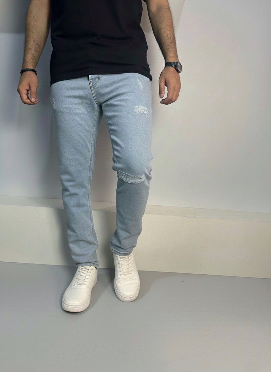 بنطلون جينز مخربش بتصميم عصري يمنحك إطلالة شبابية جريئة. مصنوع من دنيم عالي الجودة يوفر راحة ومتانة، مع تفاصيل تمزيق دقيقة تضيف لمسة ستايل مميزة تناسب الخروجات اليومية واللوك الكاجوال.