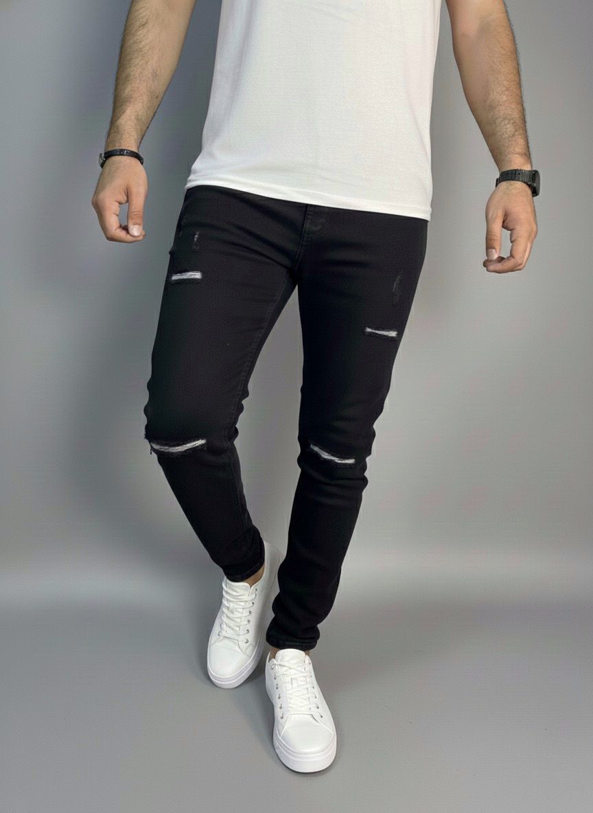 بنطلون جينز مخربش بتصميم عصري يمنحك إطلالة شبابية جريئة. مصنوع من دنيم عالي الجودة يوفر راحة ومتانة، مع تفاصيل تمزيق دقيقة تضيف لمسة ستايل مميزة تناسب الخروجات اليومية واللوك الكاجوال.